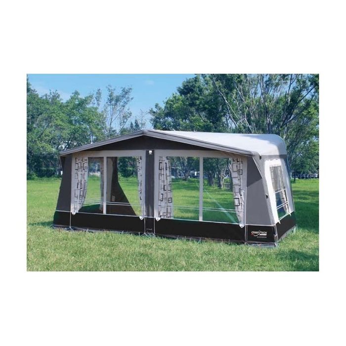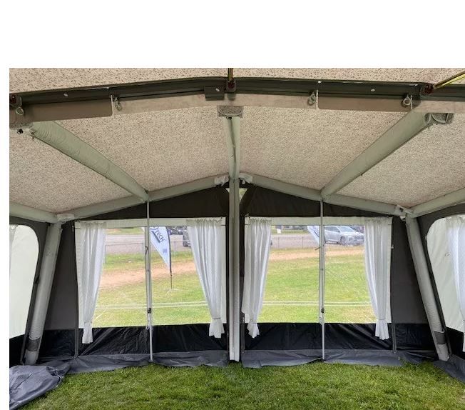 The Kensington inflatable touring awning seamlessly blends the design and space of traditional awnings with the convenience of modern inflatable technology. Featuring a central inflation point, it can be set up quickly and effortlessly. Constructed with high-quality materials, the wall is made from Climatech SR17 coated polyester, ensuring durability and ease of cleaning, while the roof is crafted from Climatech SR18 all-season coated polyester.