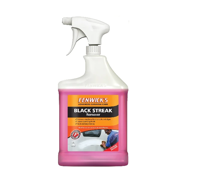 Fenwicks Black Streak Remover will easily remove black streaks, green algae, road traffic film, diesel fumes, and over wintering grime, etc. It is suitable for cleaning plastics, aluminium, GRP, ABS, fibreglass, decals, sealants and much more. Can be used on arrival at campsite for waterless spot cleaning of travel grime.