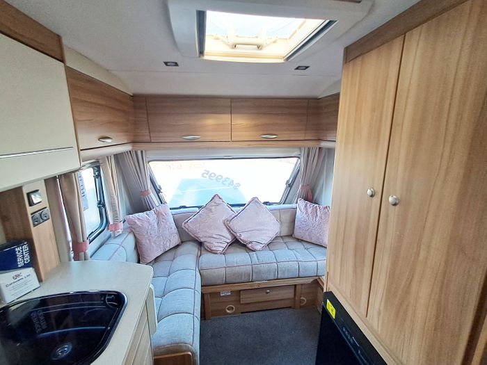 2014 Elddis Wisp 12/4 is a Two berth Caravan with a Large front dinette and a free standing table. The front settees give a good amount of seating for use during the day and convert for sleeping at night. The inside of the caravan has a modern finish with neutral tones. Above the front seating area is a Large Rooflight and Panoramic window for natural light. The heating system ensures comfortable temperatures in the colder months.