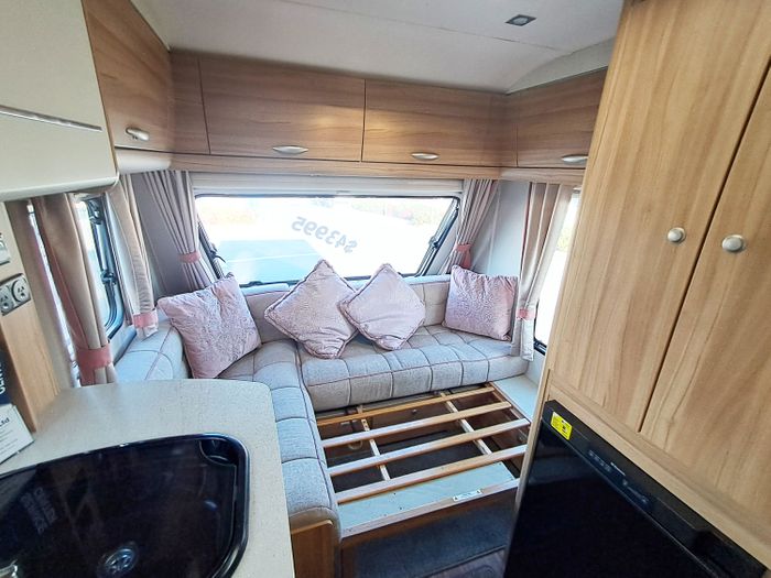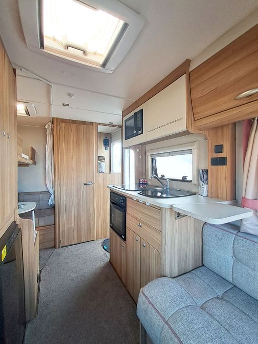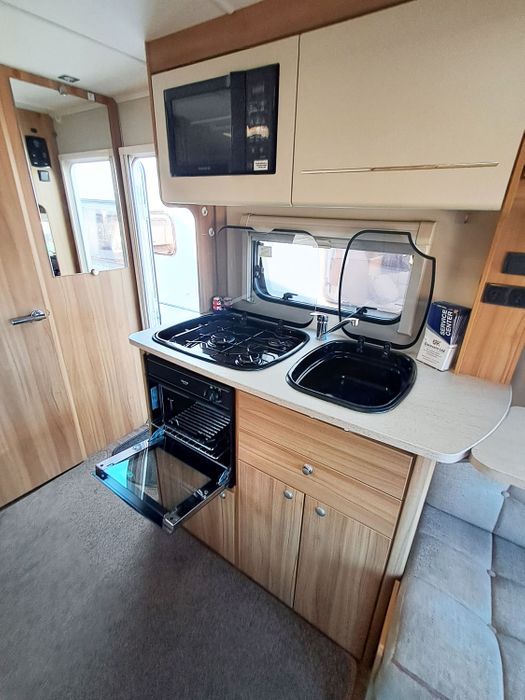 Central kitchen, by the sink you will find a 4-burner gas hob, grill and oven and a built-in microwave. A sink and a 3-way Thetford fridge and freezer. Above the kitchen is a rooflight to allow ventilation while cooking. The bathroom offers a toilet, a vanity and basin and a large shower cubicle. This caravan also comes with a Thetford cassette toilet.