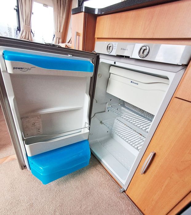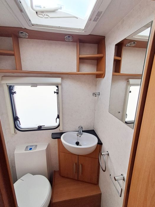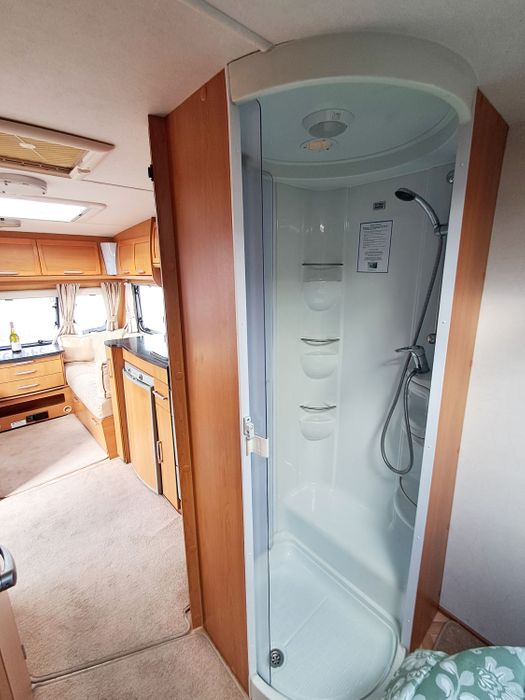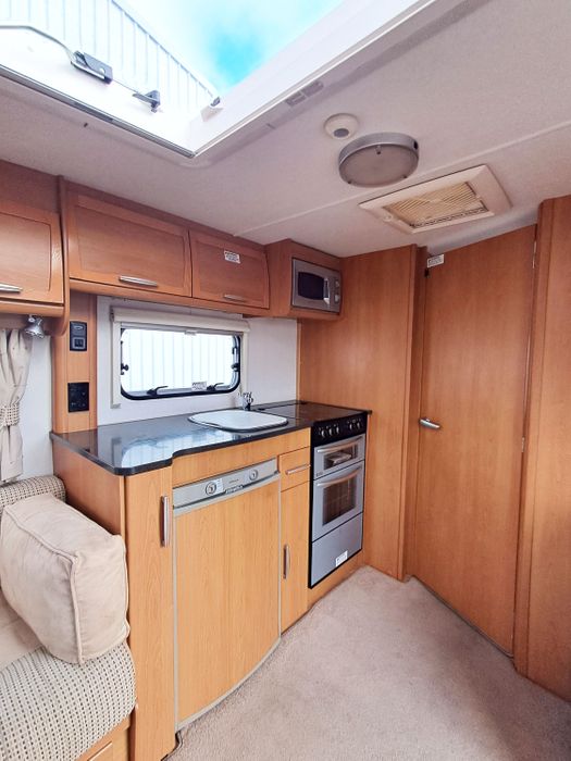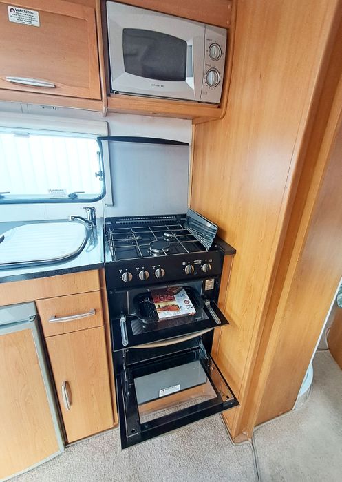 Central kitchen, by the sink you will find a 4-burner gas hob, grill and oven and a built-in microwave. A sink and a 3-way Dometic fridge and freezer. Above the kitchen is an extractor fan to allow ventilation while cooking. The bathroom offers a private toilet, a vanity and basin and a large shower cubicle. This caravan also comes with a Thetford cassette toilet.