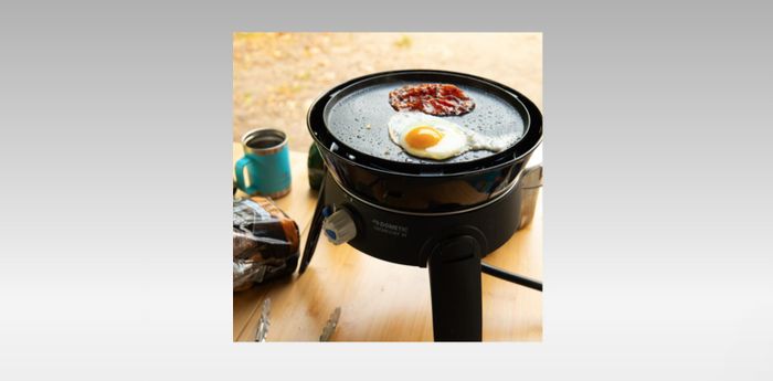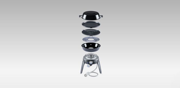 Versatile cooking using the pot stand, BBQ grid, flat grid and pan/dome (all included)
