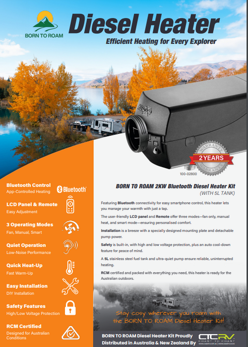 The BORN TO ROAM 2KW Bluetooth Diesel Heater Full Kit is the ultimate solution for RV, caravan, and motorhome owners who want dependable warmth without breaking the bank. Designed with over 10 years of experience and backed by years of research, this heater offers excellent value for money while maintaining top-tier performance. Whether you're exploring off-grid or spending cold nights on the road, this heater ensures a comfortable and efficient heating solution, even in the harshest conditions.