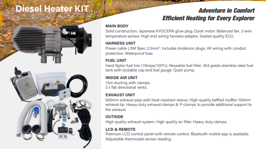 This kit is packed with everything you need, from heavy-duty clamps to quality filters and exhaust components. It’s been RCM certified and designed specifically for Australian conditions, making it a reliable choice for your next adventure. Affordable yet packed with premium features, the BORN TO ROAM 2KW Diesel Heater Kit is your go-to companion for keeping warm on the road.