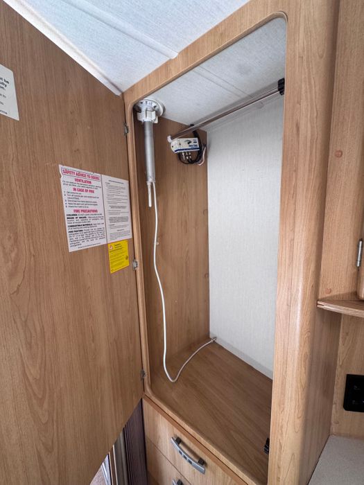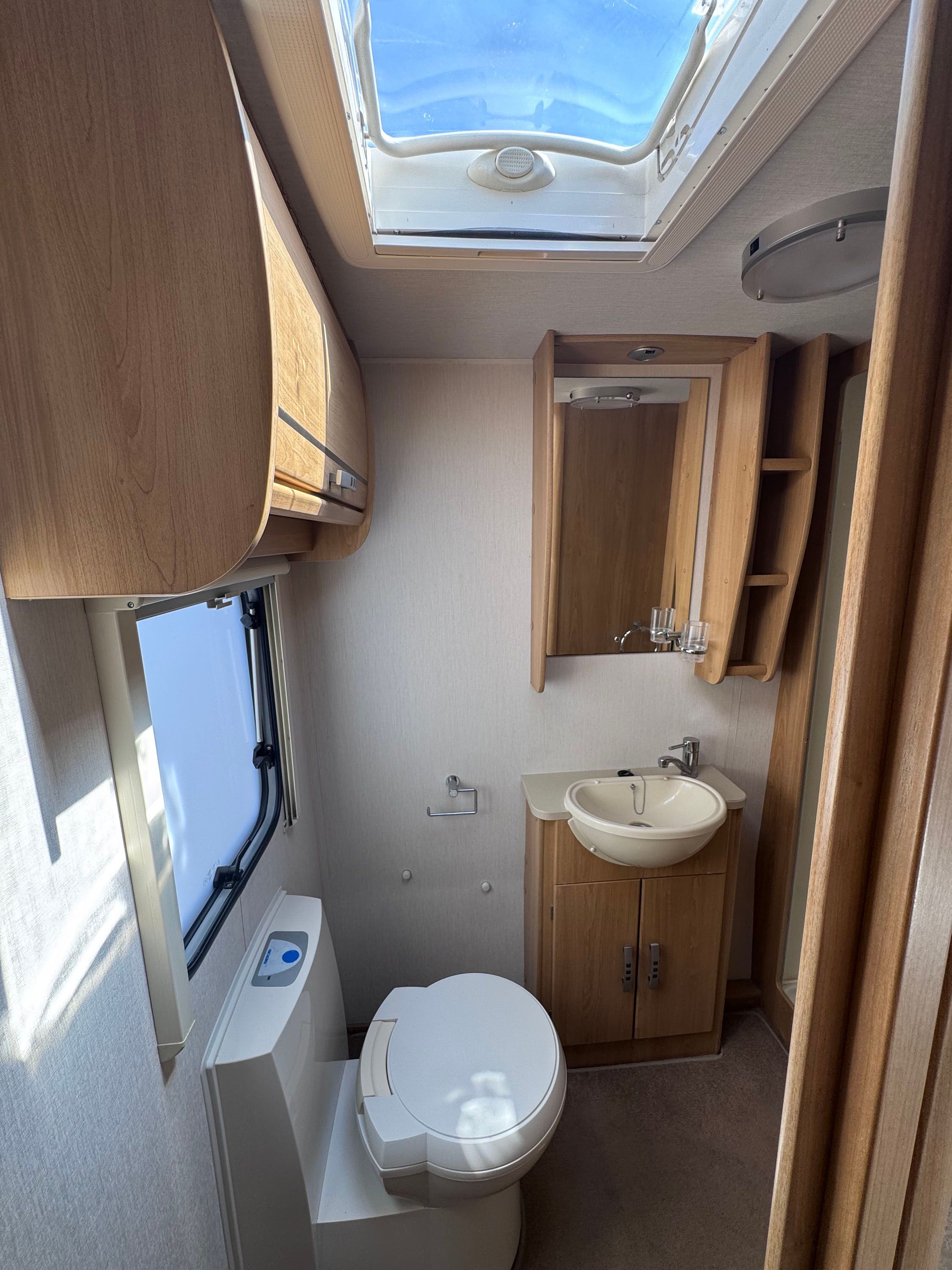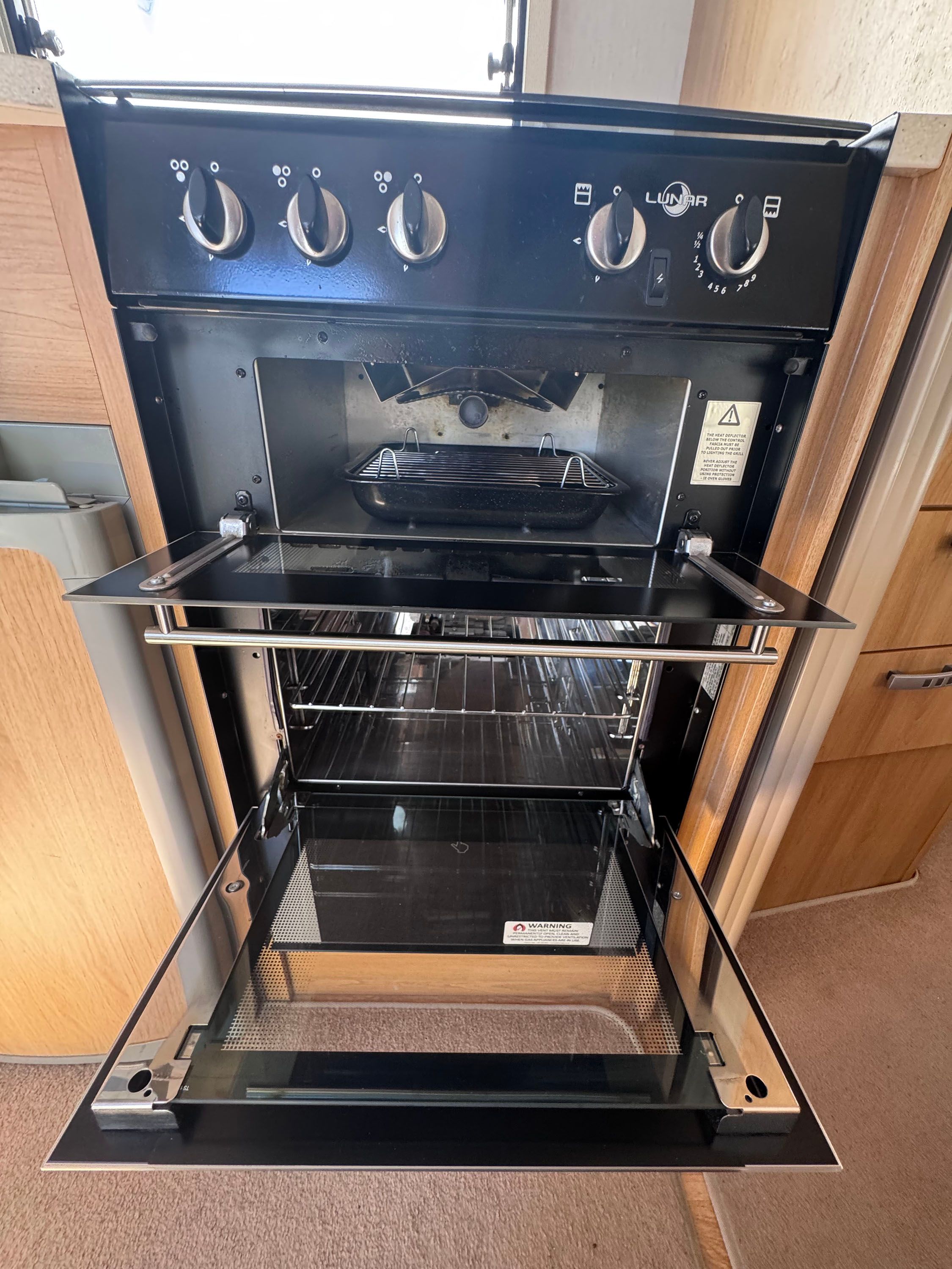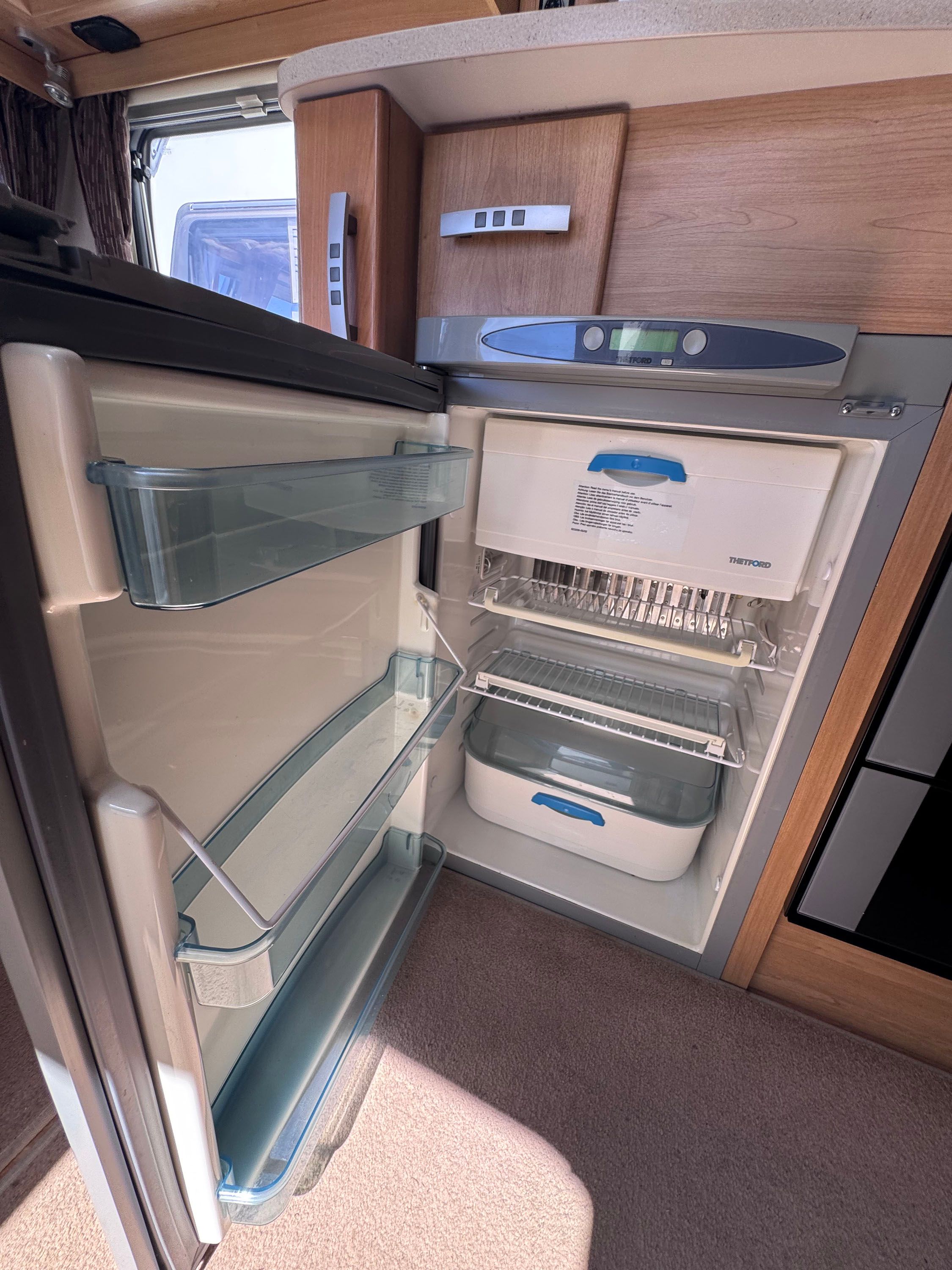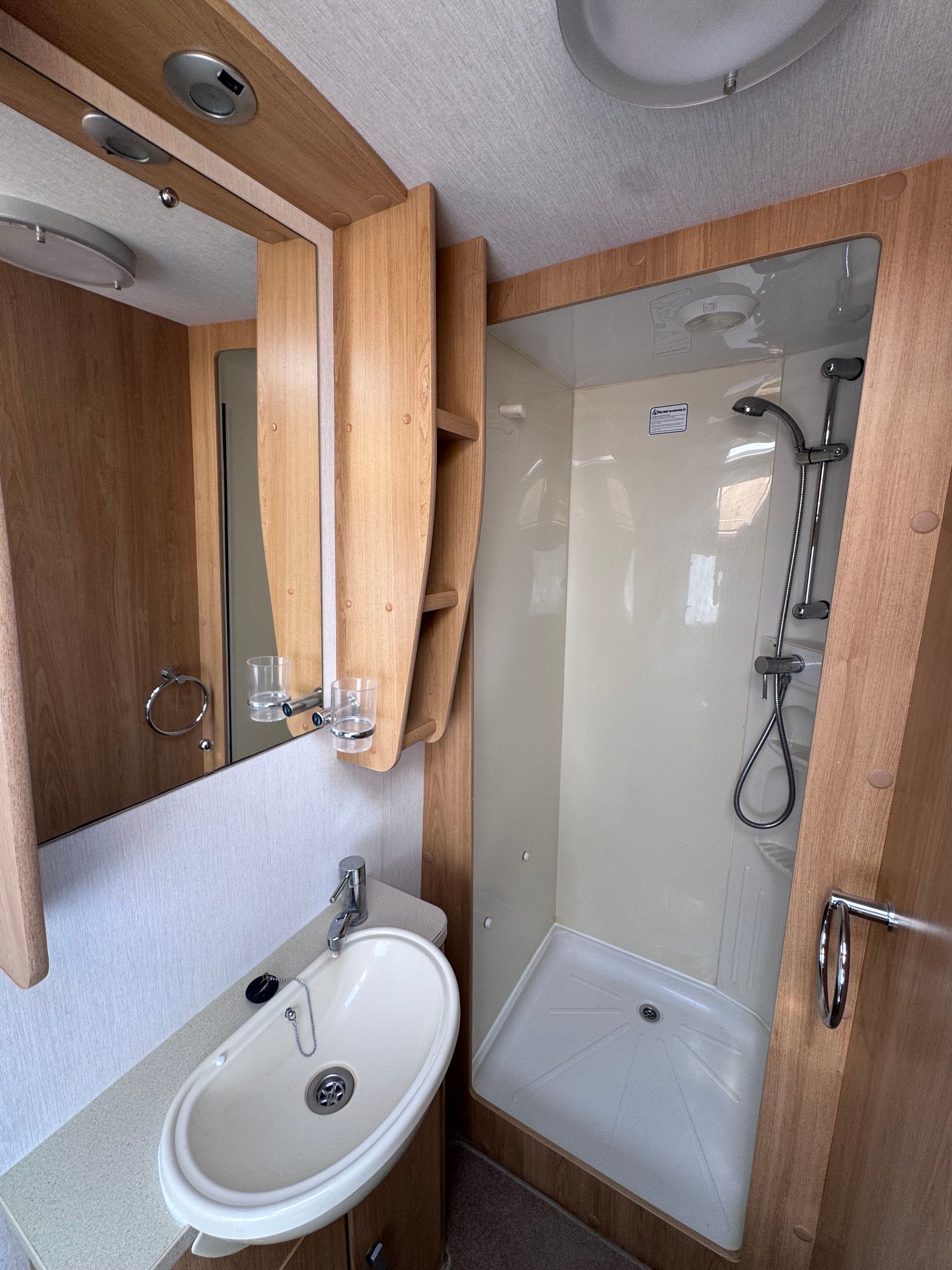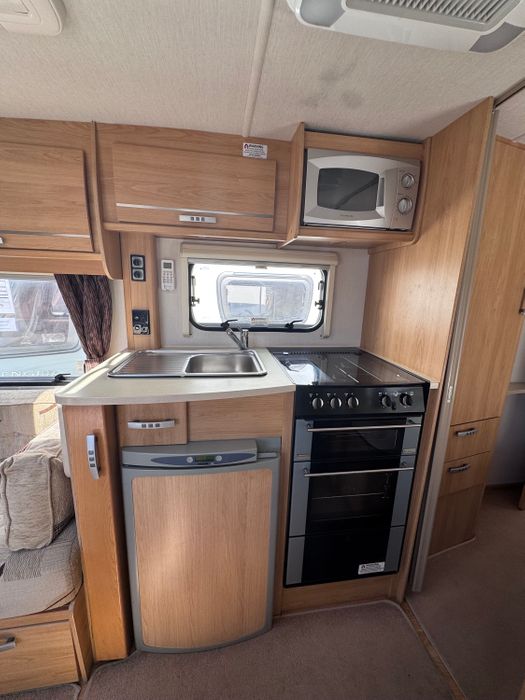 Central kitchen, by the sink you will find a 4-burner gas hob, grill and oven and a built-in microwave. A sink and a 3-way Thetford fridge and freezer. Above the kitchen is a Bluetooth operated Aircon unit. The bathroom offers a private toilet, a vanity and basin and a large shower cubicle. This caravan also comes with a Thetford cassette toilet.