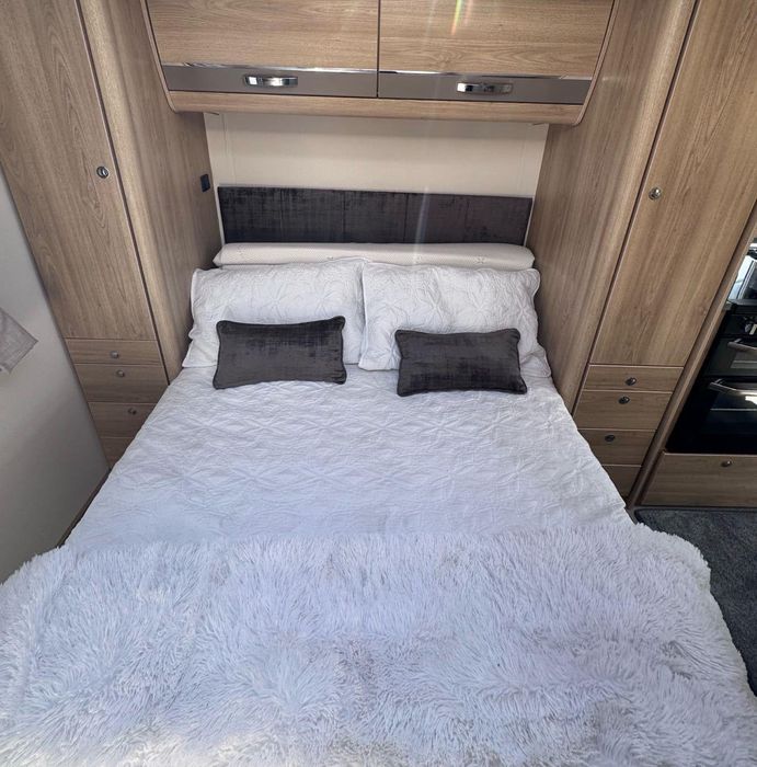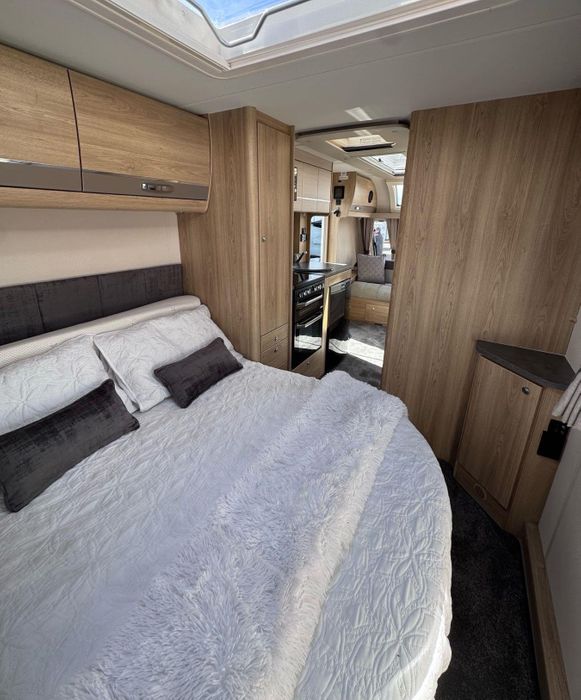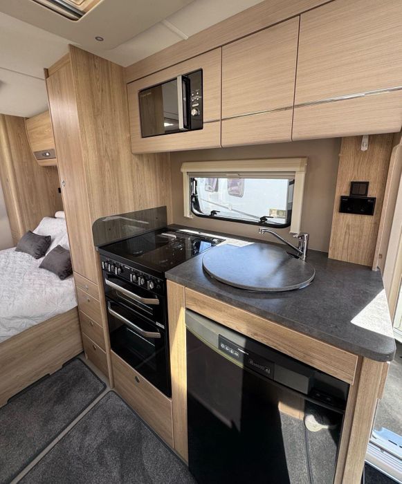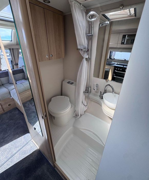 Central kitchen, by the sink you will find a 4-burner gas hob, grill, oven and microwave. A sink and a Full 3-way Dometic fridge and freezer. Above the kitchen is a Rooflight to allow ventilation while cooking. The Central bathroom offers a private toilet, a vanity and basin and a large shower cubicle. This caravan also comes with a Thetford cassette toilet.
