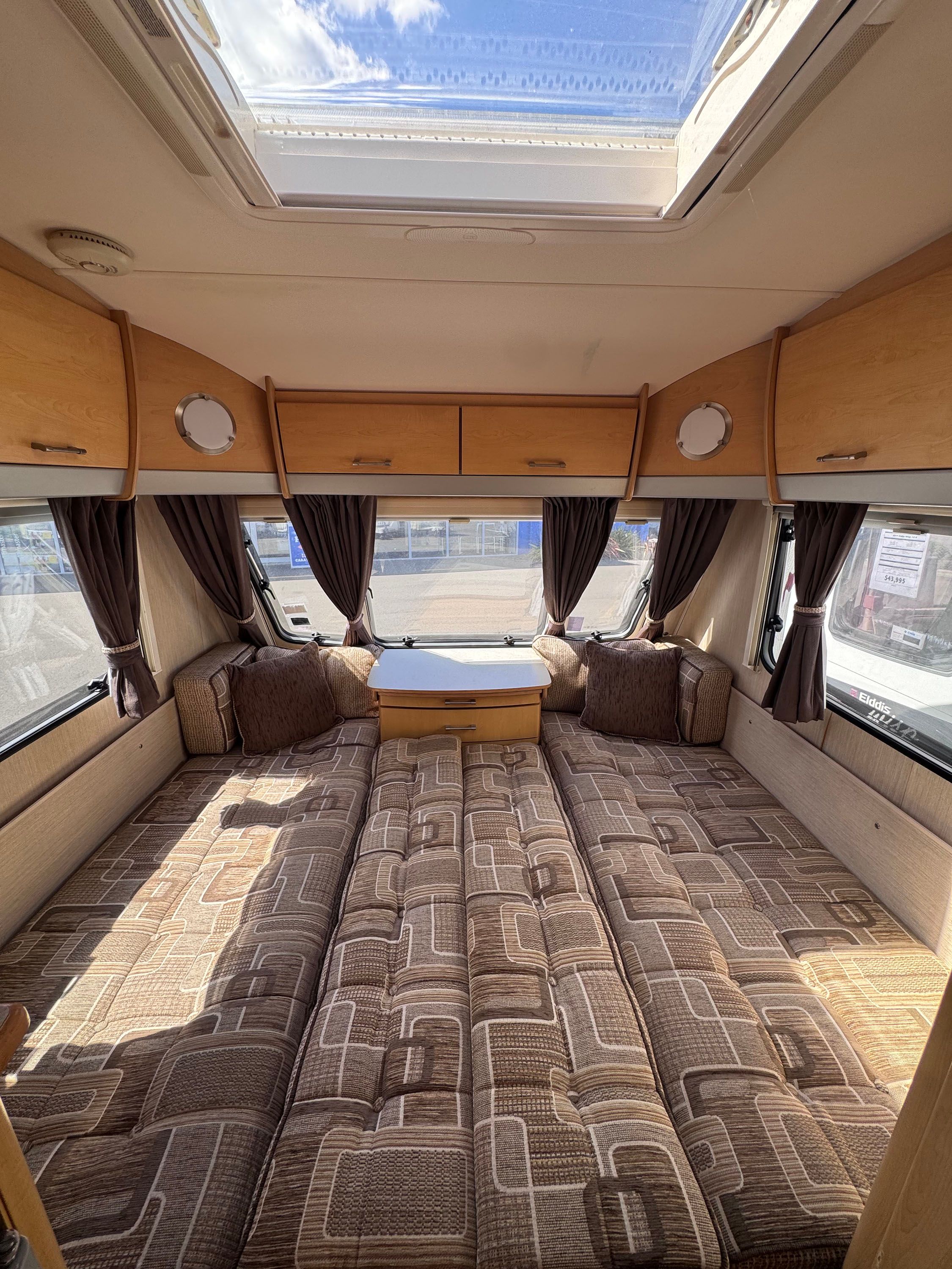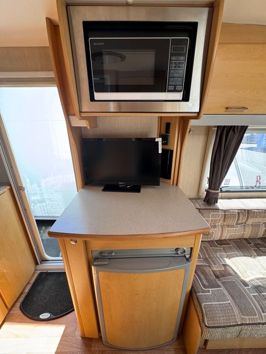 Elddis Avante club 362 is a Two berth Caravan with a Large front dinette and a free-standing table. The front settees give a good amount of seating for use during the day and convert for sleeping at night. The inside of the caravan has a modern finish with neutral tones. Above the front seating area is a Large Rooflight for natural light. The Truma heating system ensures comfortable temperatures in the colder months.