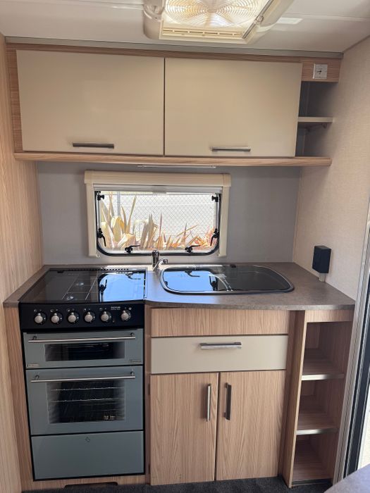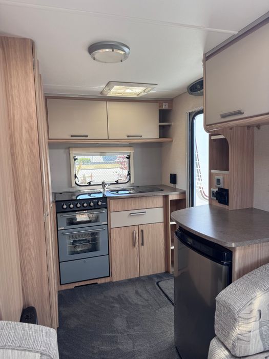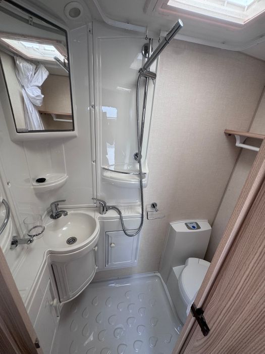 Rear kitchen, by the sink you will find a Thetford 4-burner gas hob, grill, oven and microwave. A sink and a 3-way Thetford fridge and freezer. The Offside Rear bathroom offers a private toilet, a vanity and basin and a large shower cubicle. This caravan also comes with a Thetford cassette toilet.