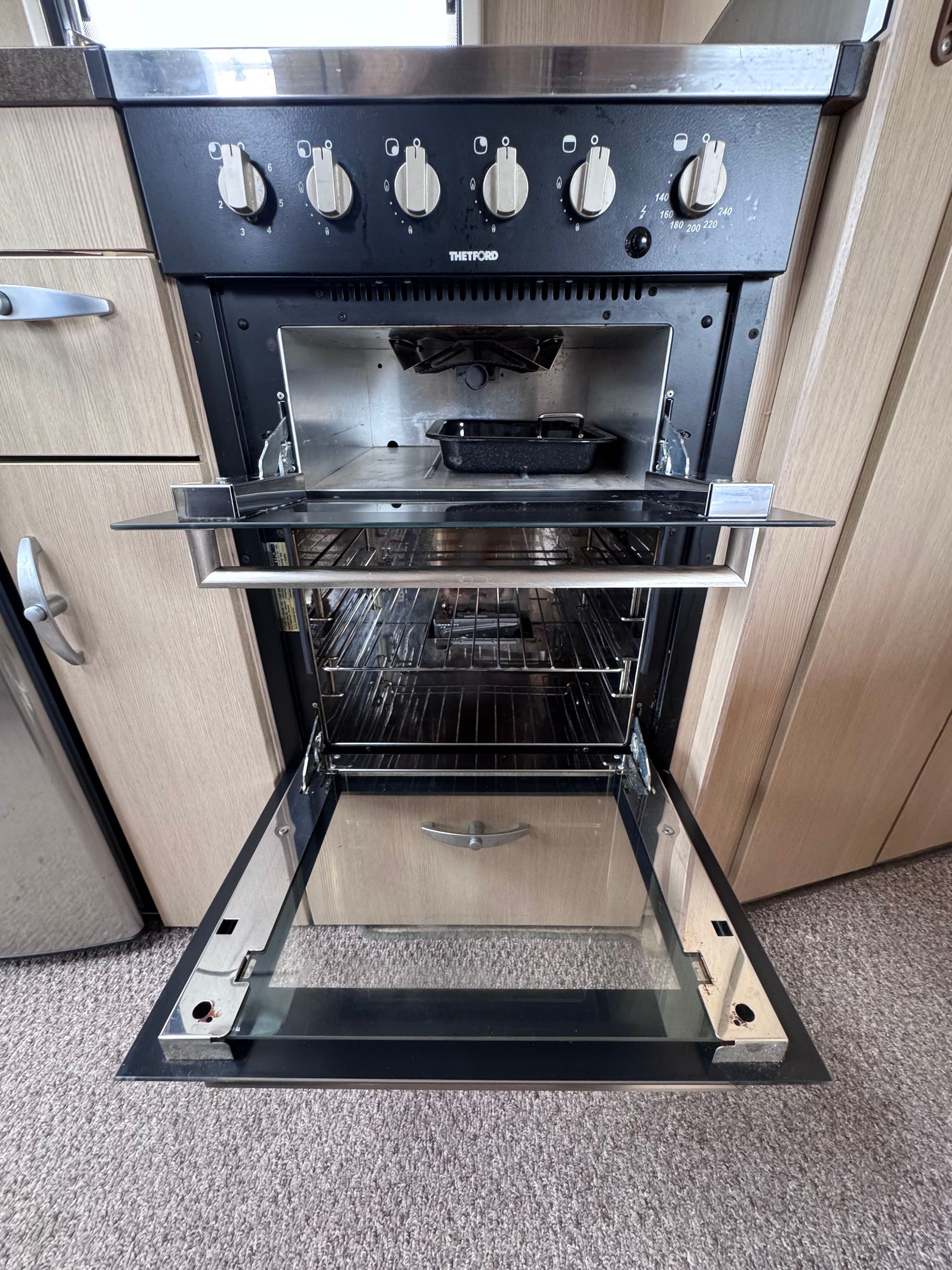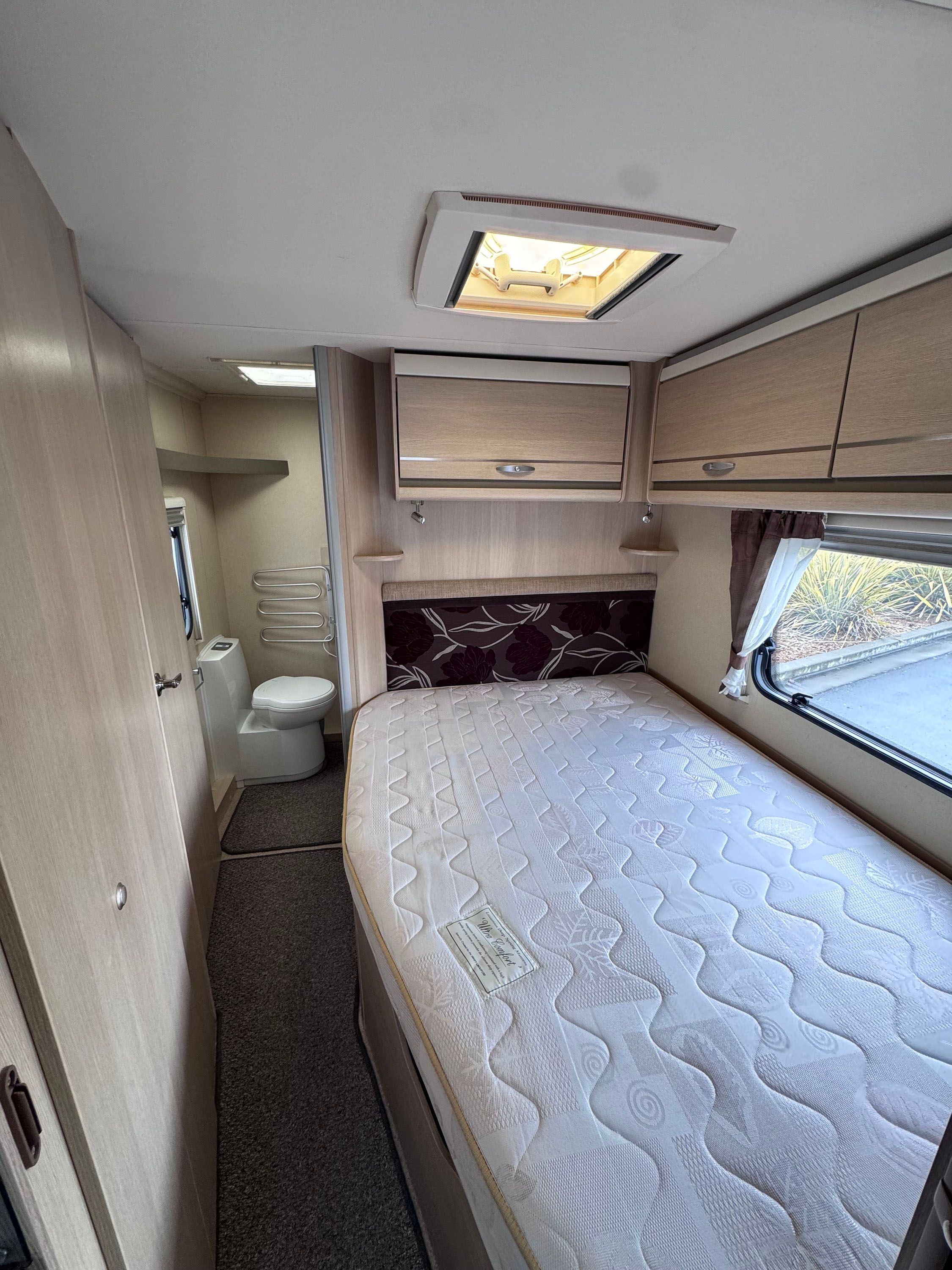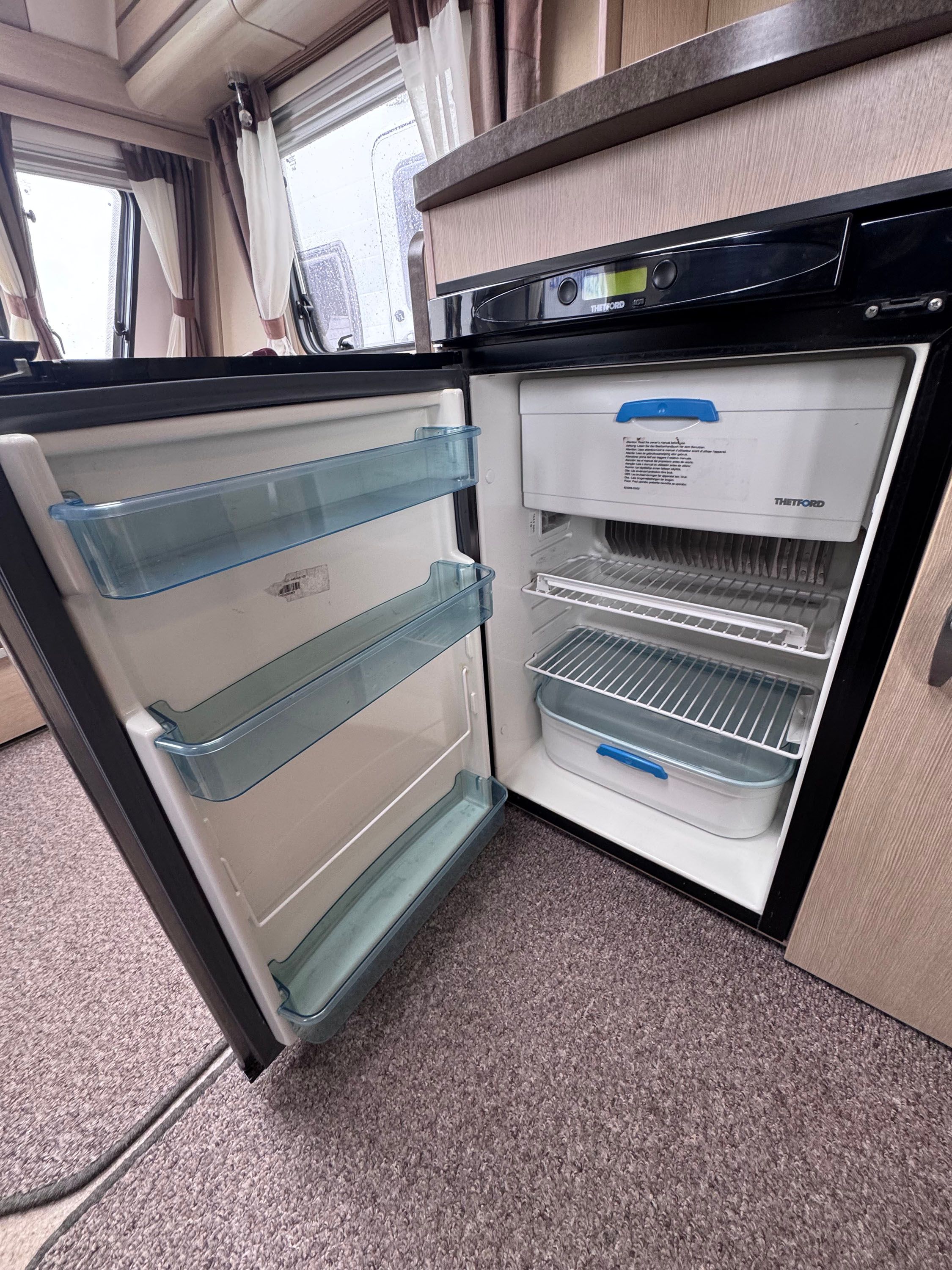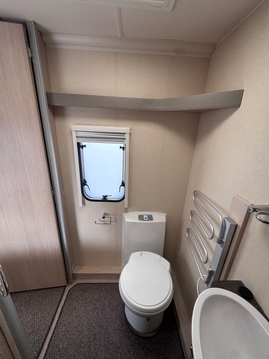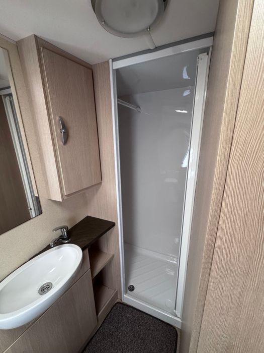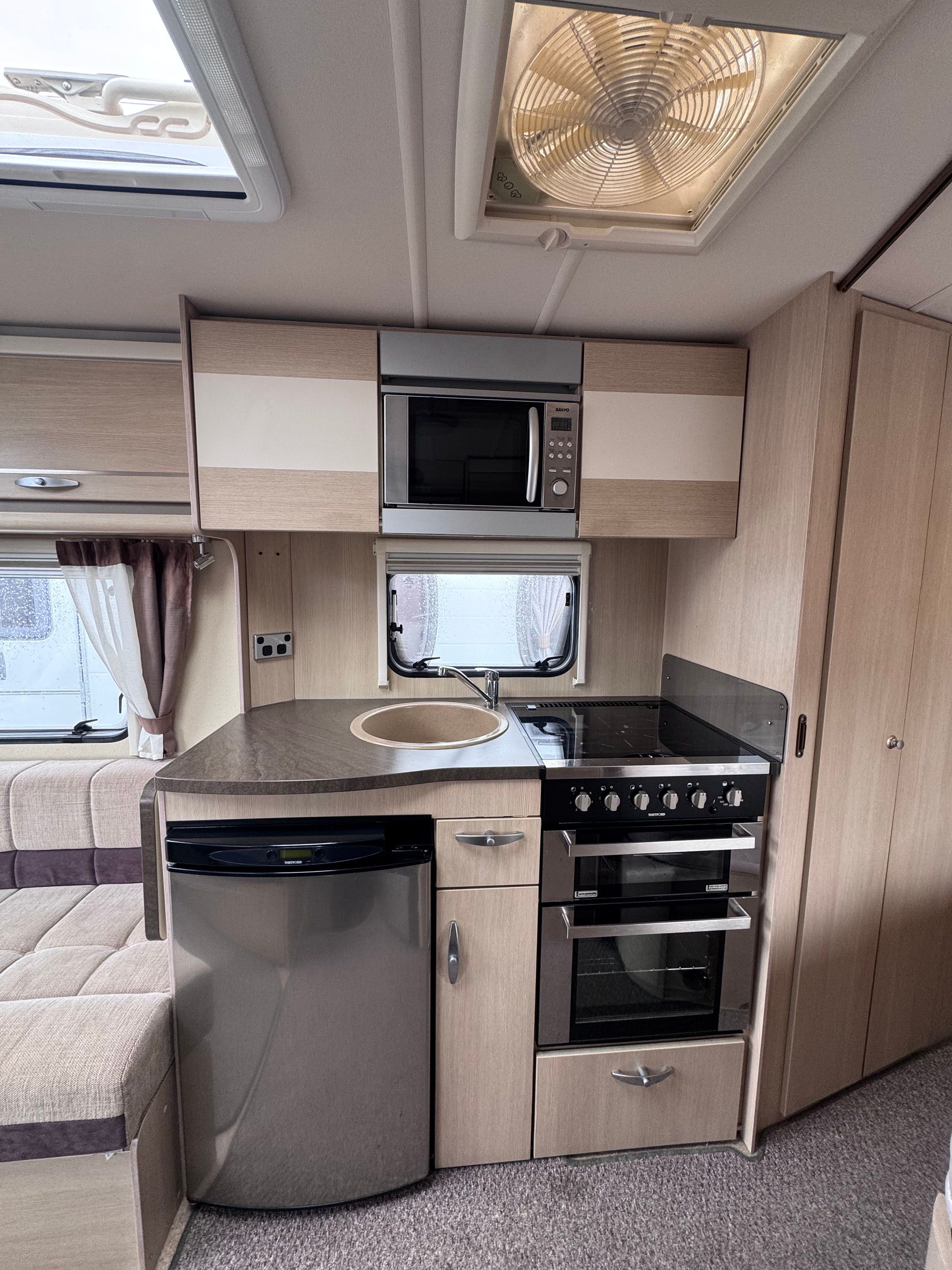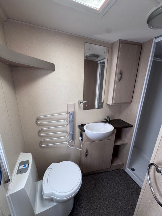 Central kitchen, by the sink you will find a 4-burner gas hob, grill, oven and microwave. A sink and a 3-way Thetford fridge and freezer. The Rear bathroom offers a private toilet, a vanity and basin and a large shower cubicle. This caravan also comes with a Thetford cassette toilet.