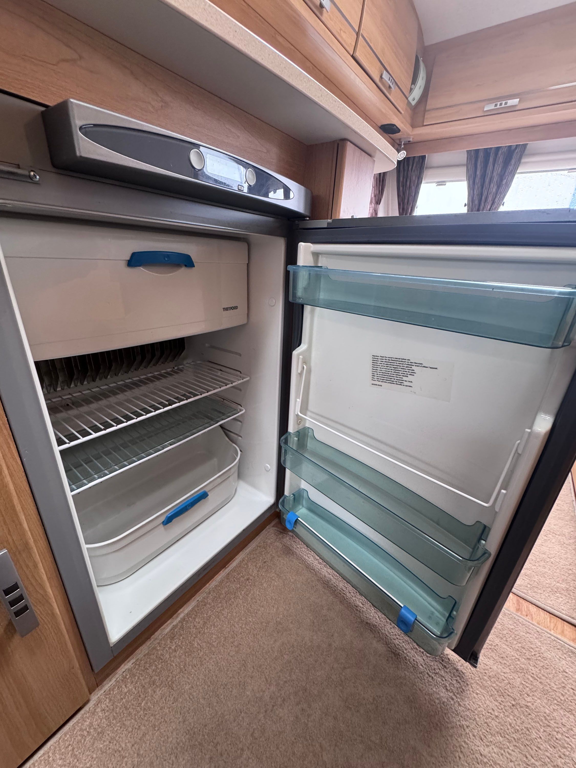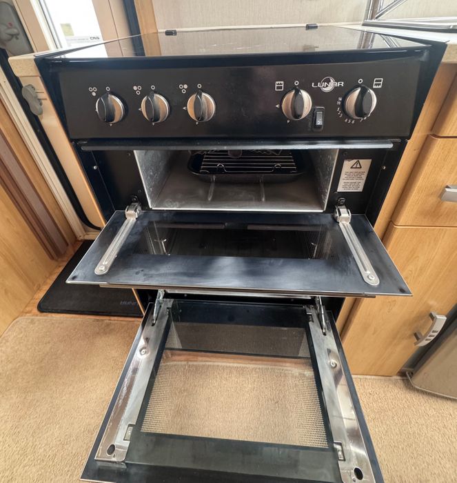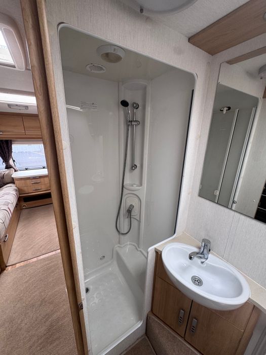 Central kitchen, by the sink you will find a Thetford 4-burner gas hob, grill, oven, Microwave, sink and a 3-way Thetford fridge and freezer. The Central Private bathroom offers a private toilet, a vanity and basin and a large shower cubicle. This caravan also comes with a Thetford cassette toilet.