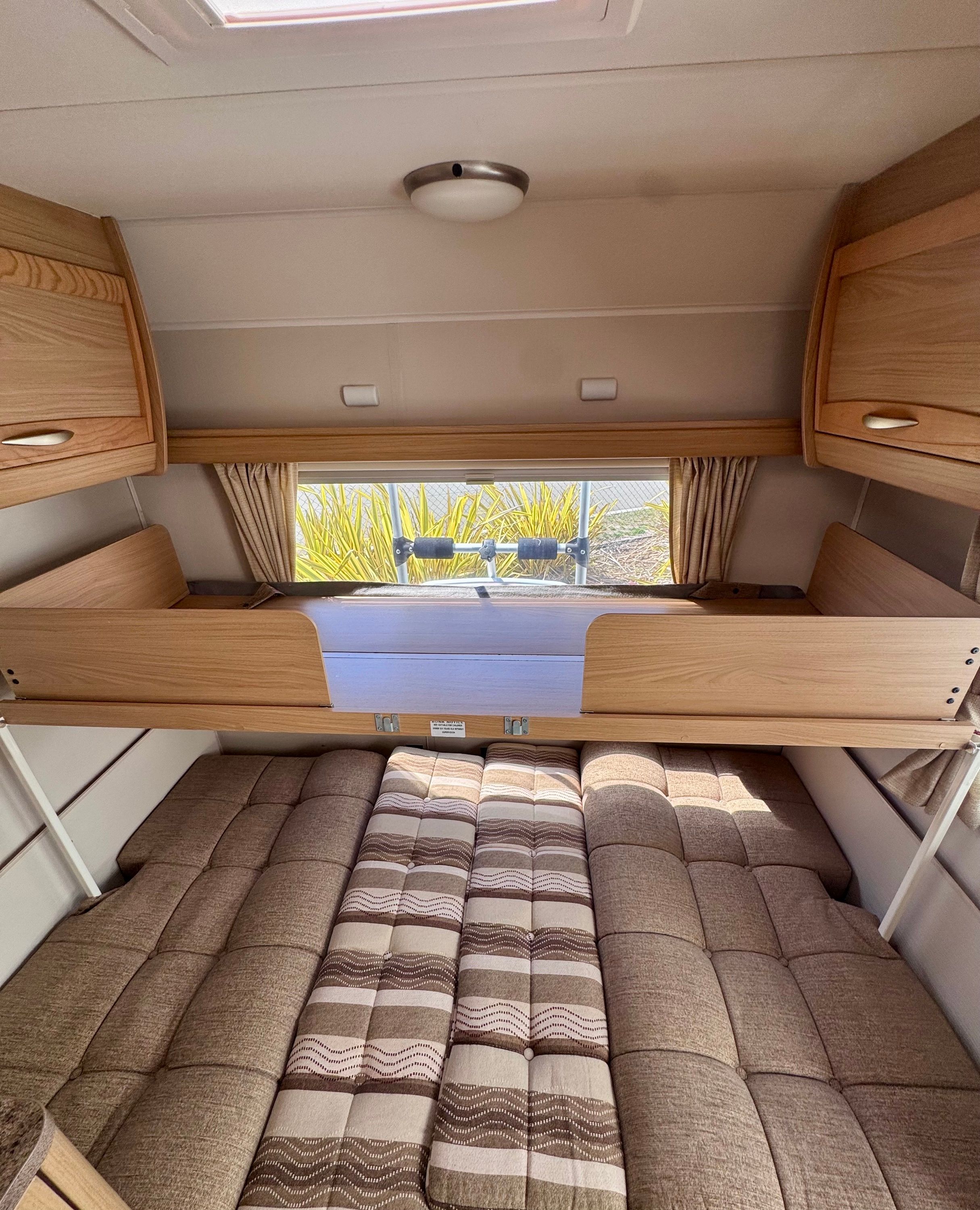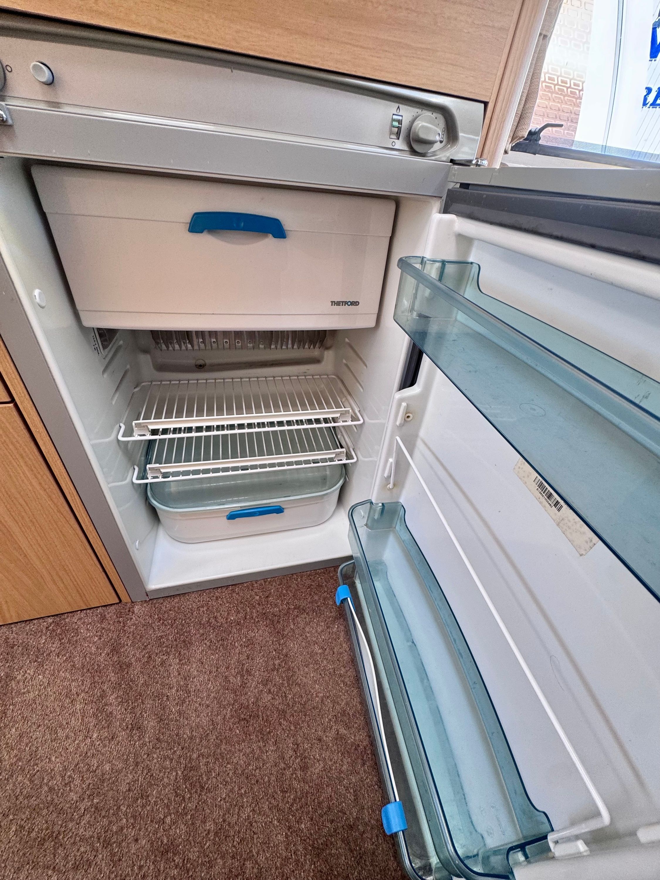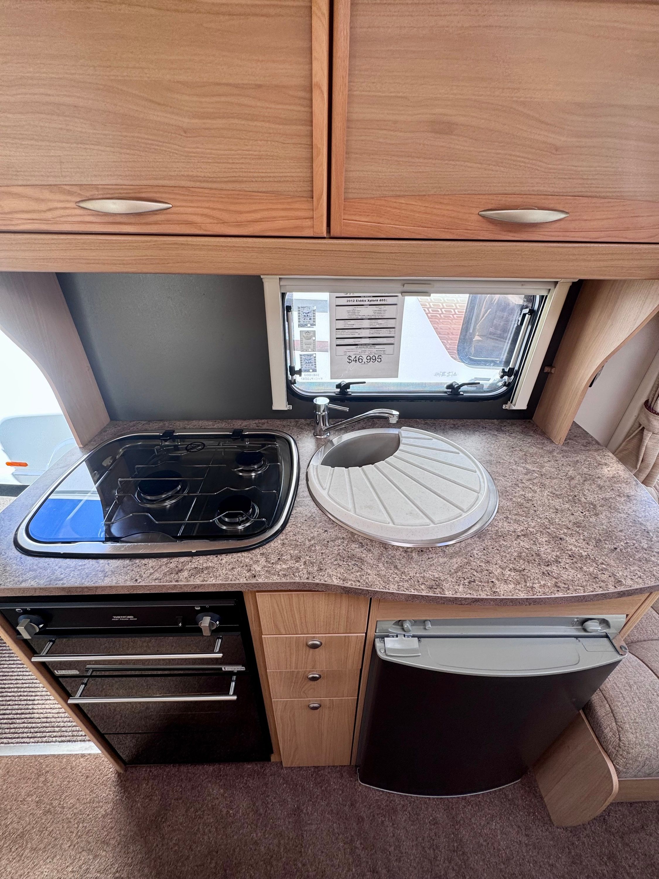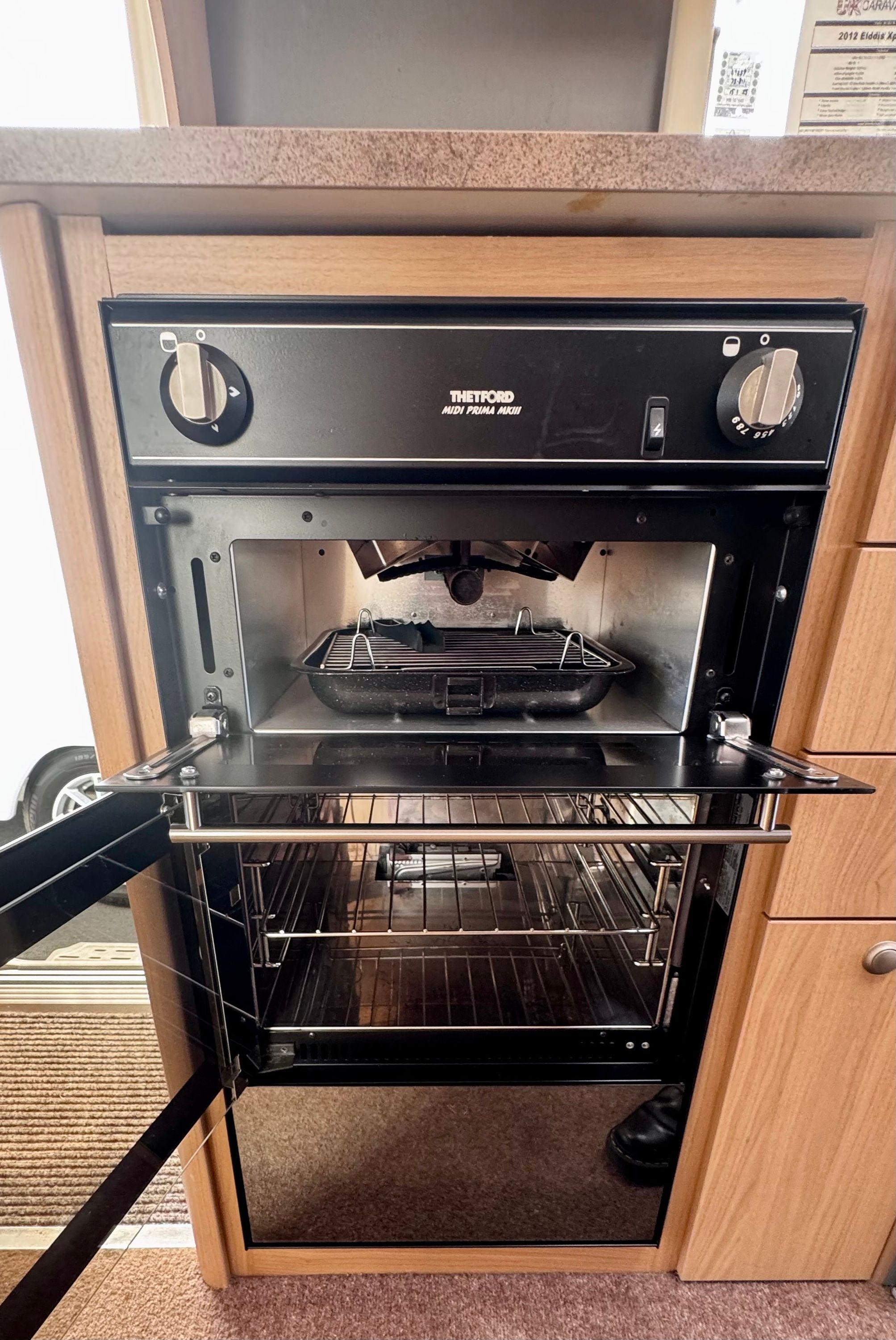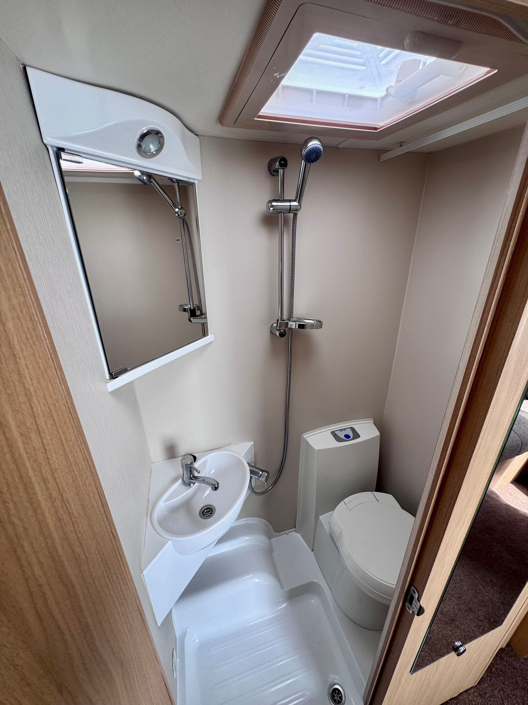 Central kitchen, by the sink you will find a Thetford 4-burner gas hob, grill, oven, sink and a 3-way Thetford fridge and freezer. The Central Private bathroom offers a private toilet, a vanity and basin and a large shower cubicle. This caravan also comes with a Thetford cassette toilet.