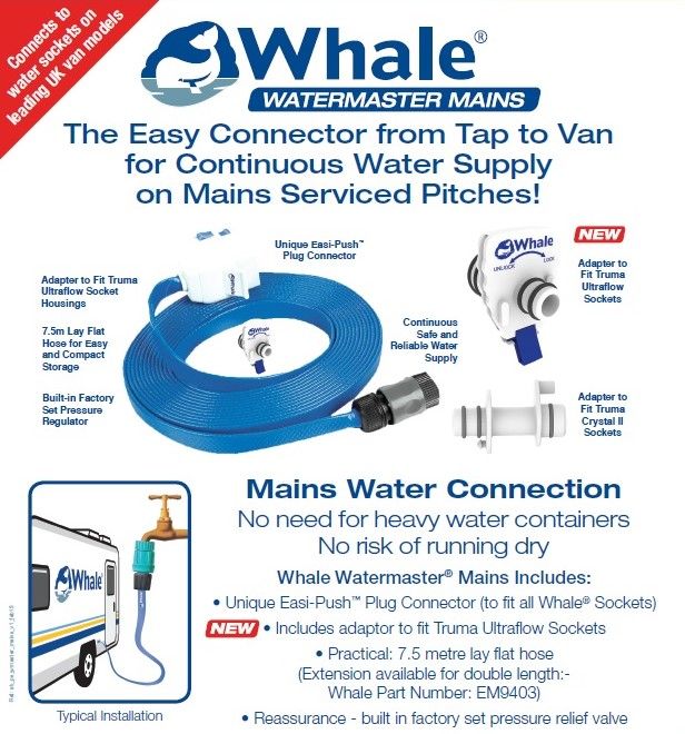 Features: Fits all current UK caravans. 'Easi-Push' plug connector The Whale mains water connector is compatible with all Whale sockets and Truma Ultraflow socket. Use with adapter EM9407 to connect to Truma Crystal II sockets. Compact storage for your caravan or motorhome