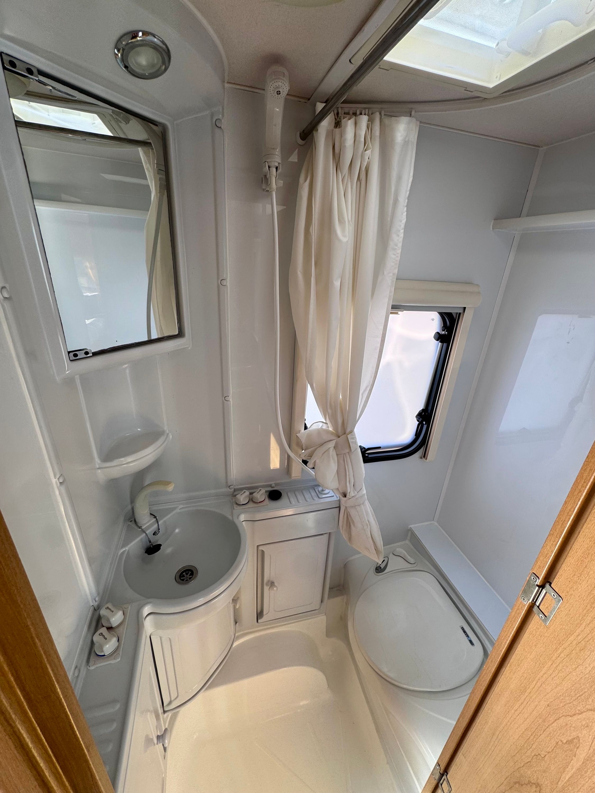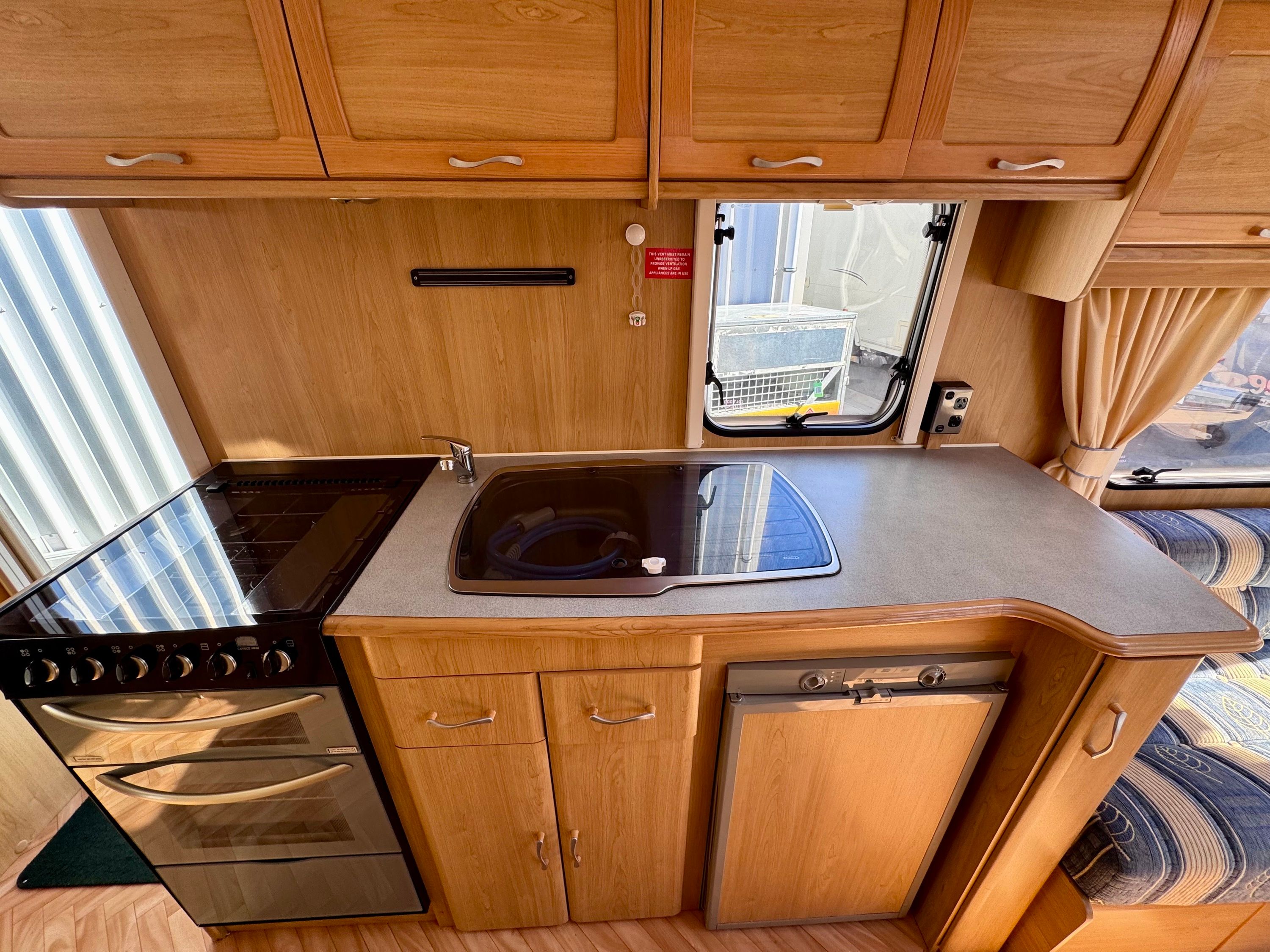Central Kitchen, by the sink you will find a Thetford 4-burner gas hob, grill, oven, sink and a 3-way Dometic fridge and freezer. The Central bathroom offers a toilet, a vanity and basin and a shower cubicle. This caravan also comes with a Thetford cassette toilet.