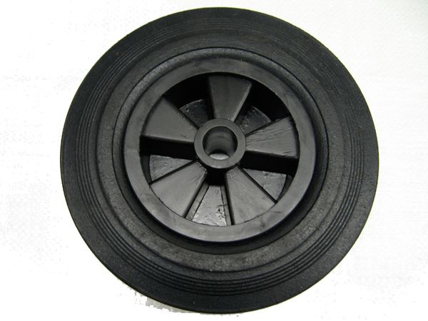 Standard euro hole size. Plastic wheel with rubber tyre
